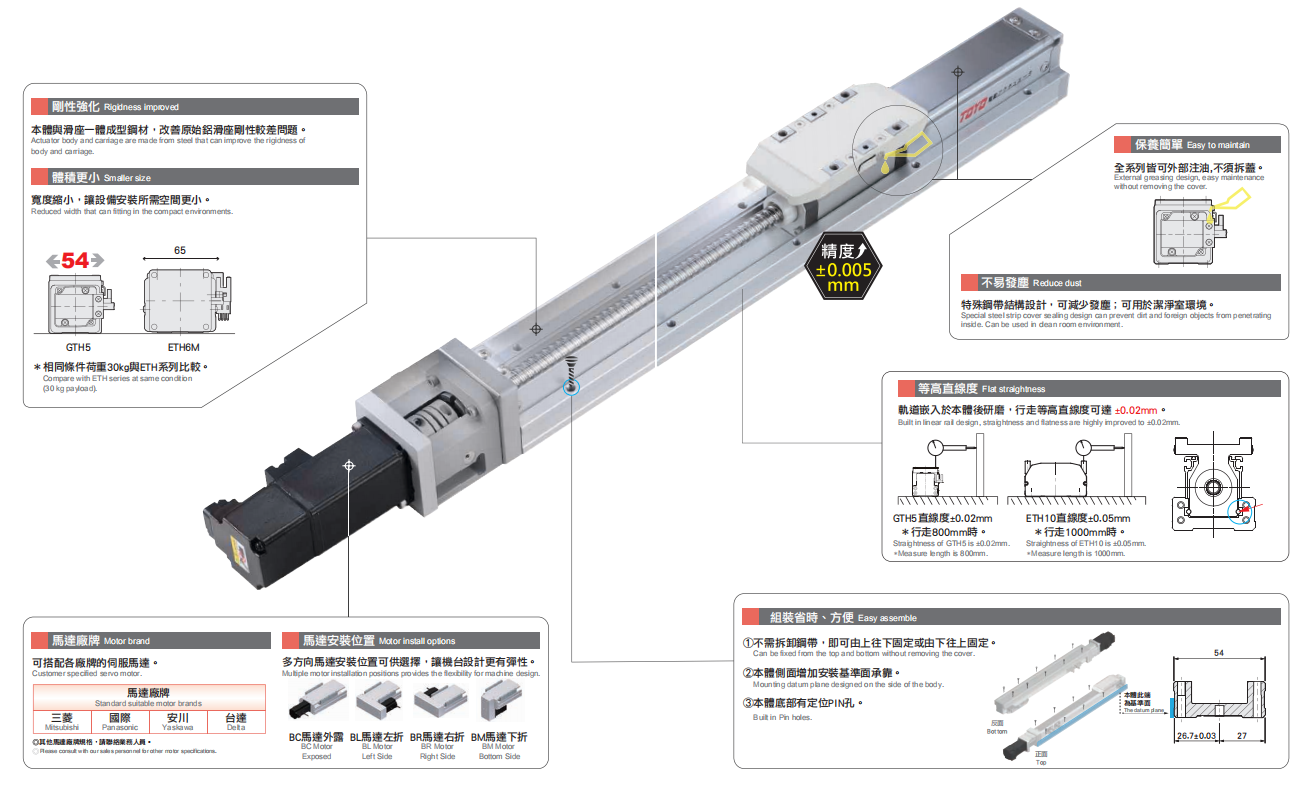 TOYO/GTH系列滑台等高直线度: 轨道嵌入于本体研磨,行走等高直线度可达+0.02mm。